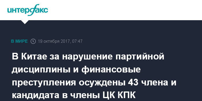 Москва. 19 октября. INTERFAX.RU - За различного рода нарушения дисциплины и коррупцию за пять лет после 18-го съезда КПК в Китае осуждены 43 члена и кандидата в члены Центрального комитета партии, девять сотрудников аппарата Центральной комиссии КПК по проверке дисциплины, сообщил журналистам заместитель руководителя этой комиссии Ян Сяоду.