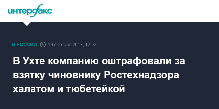 Москва. 19 октября. INTERFAX.RU - Суд в Ухте (Коми) оштрафовал на 1 млн рублей ООО "Эриэлл НефтегазСервис" за незаконное вознаграждение начальника отдела управления Ростехнадзора, получившего узбекский халат и тюбетейку.
