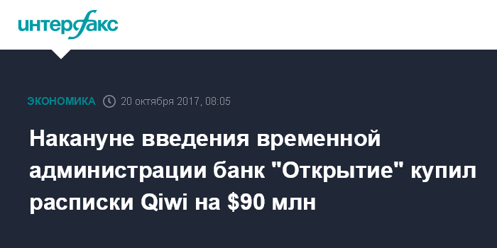 Накануне введения временной администрации банк "Открытие" купил расписки Qiwi на $90 млн