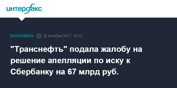 Москва. 20 октября. INTERFAX.RU - "Транснефть" подала кассационную жалобу на решение апелляционного суда по иску компании к Сбербанку на 67 млрд рублей, сообщил "Интерфаксу" советник президента трубопроводной монополии, пресс-секретарь Игорь Демин.