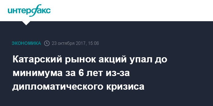 Москва. 23 октября. INTERFAX.RU - Основной фондовый индекс Катара QE Index по итогам торгов в понедельник опустился до минимума с августа 2011 года из-за отсутствия прогресса на переговорах, которые должны были положить конец дипломатической и экономической изоляции ближневосточного государства. К концу сессии QE Index снизился на 0,5%, до 8117,41 пункта, свидетельствуют данные торгов. С начала дипломатического кризиса индикатор потерял 18%.