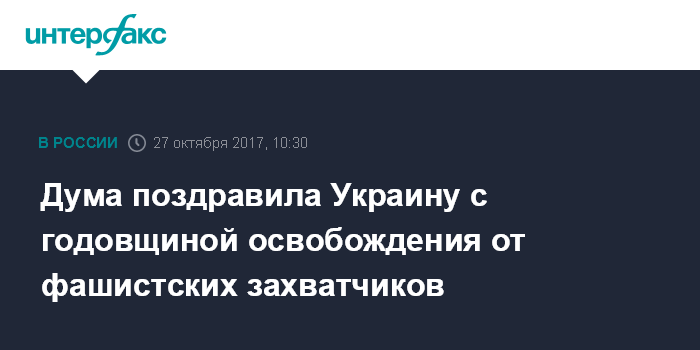 Москва. 27 октября. INTERFAX.RU - Госдума на заседании в пятницу приняла постановление о поздравлении народа Украины с 73-й годовщиной освобождения от немецко-фашистских захватчиков.