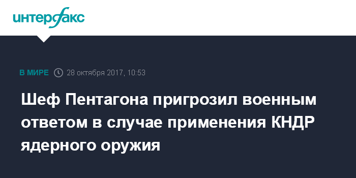 Москва. 28 октября. INTERFAX.RU - Глава Пентагона Джеймс Мэттис предупредил, что США будут готовы дать массированный военный ответ в случае применения КНДР ядерного оружия.