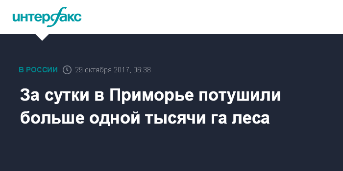 Москва. 29 октября. INTERFAX.RU - Лесные пожары на площади более 1 тыс. га потушены за сутки в шести муниципалитетах Приморья, сообщила пресс-служба администрации региона.