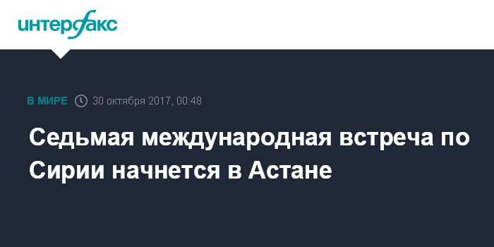 Москва. 30 октября. INTERFAX.RU - В столице Казахстана 30-31 октября пройдет очередная, седьмая по счету международная встреча по Сирии. Как сообщил ранее МИД Казахстана, пленарное заседание в Астане с участием всех сторон запланировано на 31 октября.