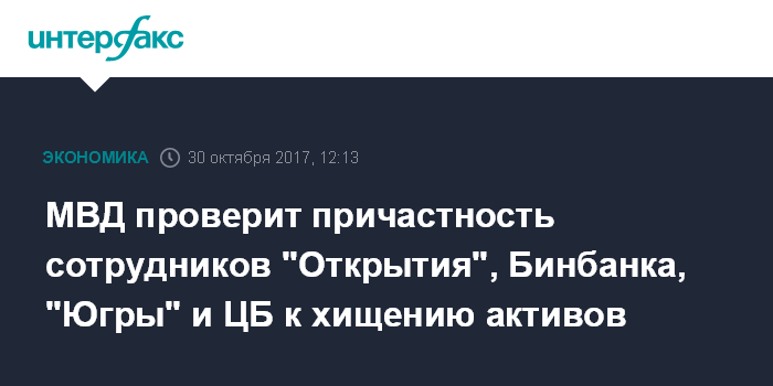 Министерство сообщило, что запросило у Банка России сведения о возможной противоправной деятельности руководителей и сотрудников санируемых Бинбанка и банка "Открытие". Кроме того, МВД запросило данные о возможной противоправной деятельности должностных лиц Банка России, связанной с хищением активов "Открытия", Бинбанка и "Югры".