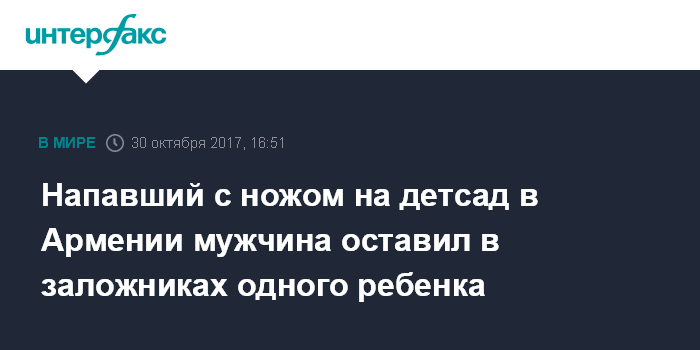 Как сообщалось ранее, неизвестный мужчина напал с ножом на детсад в городе Армавир в 48 км к западу от Еревана. В пресс-службе полиции Армении "Интерфаксу" сообщили, что получено "соответствующее сообщение, на место выехала группа".