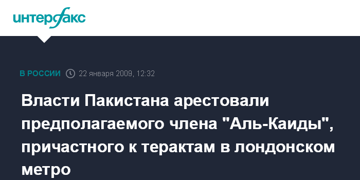 Москва. 22 января. INTERFAX.RU - Пакистанские власти арестовали предполагаемого члена террористической организации "Аль-Каида", причастного к терактам в лондонском метро в 2005 году, заявили власти страны.
