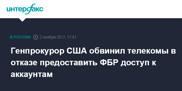 Москва. 2 ноября. INTERFAX.RU - Генеральный прокурор США Джефф Сешнс в четверг обвинил технологические компании в том, что они не оказывают помощи федеральным следователям и не предоставляют спецслужбам доступа к зашифрованным данным пользователей.