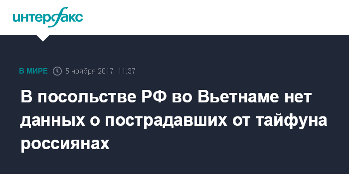 Москва. 5 ноября. INTERFAX.RU - Посольство России во Вьетнаме не располагает информацией о россиянах, пострадавших в результате удара по стране тайфуна "Дамри".
