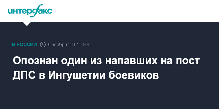 Москва. 6 ноября. INTERFAX.RU - Установлена личность одного из двух напавших на стационарный пост ДПС в Ингушетии бандитов, которые были уничтожены полицейскими ответным огнем, сообщил "Интерфаксу" информированный источник.