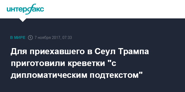 Москва. 7 ноября. INTERFAX.RU - В утвержденное меню обеда президента США Дональда Трампа в ходе первого дня пребывания в столице Южной Кореи включено блюдо из креветок, которому южнокорейские СМИ приписывают "дипломатический подтекст".