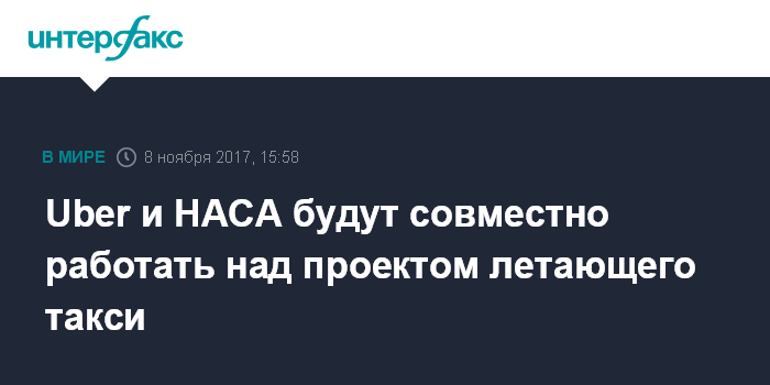 Москва. 8 ноября. INTERFAX.RU - Национальное управление по аэронавтике и исследованию космического пространства (NASA, НАСА) США и компания Uber Technologies Inc. в среду подписали соглашение о совместной разработке проекта летающих такси на электрической тяге.