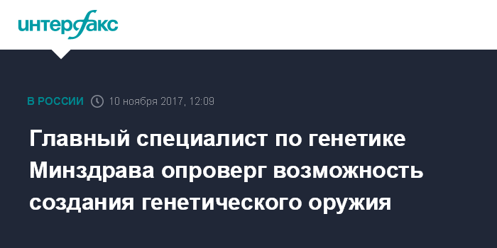 Москва. 10 ноября. INTERFAX.RU - Разработка генетического оружия на основе биоматериалов россиян - это миф, который не имеет ничего общего с реальностью, заявил главный специалист по медицинской генетике Минздрава России, директор "Медико-генетического научного центра", член-корреспондент РАН Сергей Куцев.