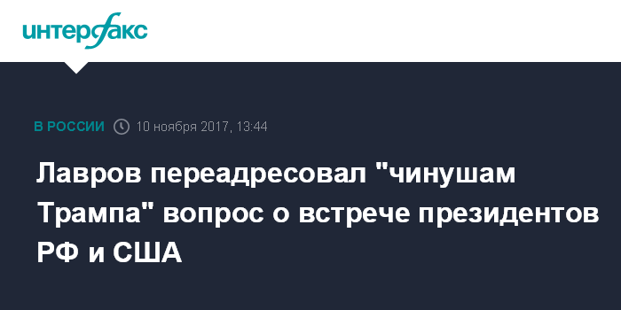 "Обращайтесь к американцам. Мы вообще на эту тему не говорим. Мы говорим, что мы слышали о желании президента Трампа встретиться с президентом Путиным, высказанное самим президентом Трампом. Что говорят остальные его чинуши, я не знаю, я не могу за это отвечать", - сказал Лавров, отвечая на вопросы журналиста российского телевидения.