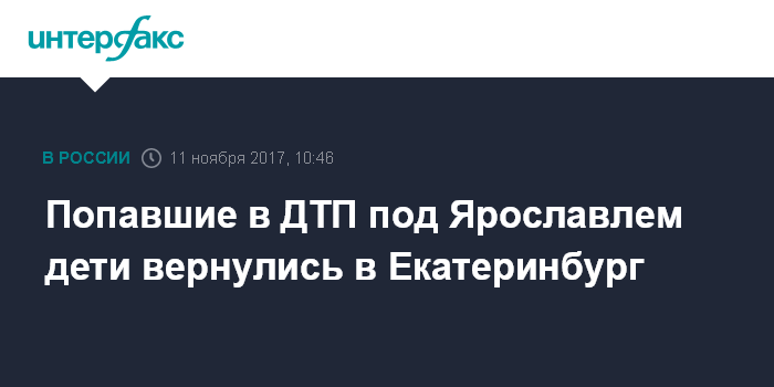 Москва. 11 ноября. INTERFAX.RU - Школьники из Екатеринбурга, которые в среду попали в аварию под Ярославлем во время тура по "Золотому кольцу" и не пострадали, в ночь на субботу вернулись домой, сообщил "Интерфаксу" представитель пресс-службы администрации города.