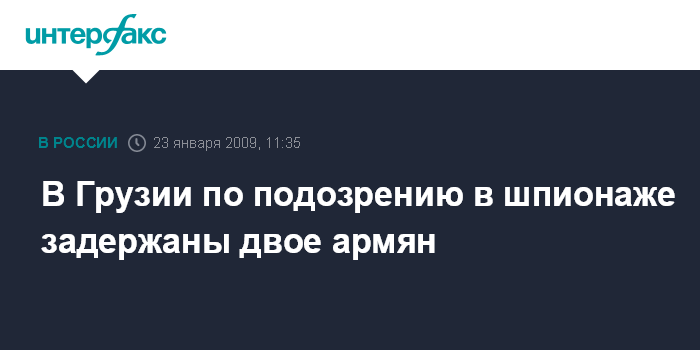 Москва. 23 января. INTERFAX.RU - Двое граждан Грузии армянской национальности задержаны по подозрению в шпионаже, сообщило в пятницу МВД Грузии.