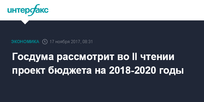 Москва. 17 ноября. INTERFAX.RU - Госдума РФ в пятницу рассмотрит во втором чтении проект закона о федеральном бюджете на 2018-2020 годы.