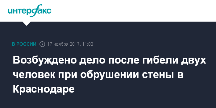 Москва. 17 ноября. INTERFAX.RU - Уголовное дело возбуждено в Краснодаре по факту гибели двух человек и травмирования еще одного при обрушении стены производственного здания. Об этом сообщила агентству "Интерфакс" официальный представитель следственного управления СКР по краю Наталья Смяцкая в пятницу.