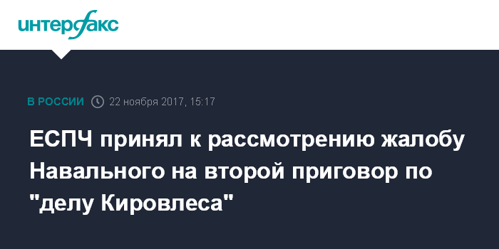 Москва. 22 ноября. INTERFAX.RU - Оппозиционер Алексей Навальный сообщил, что Европейский суд по правам человека принял к рассмотрению его жалобу на новый приговор по делу "Кировлеса".