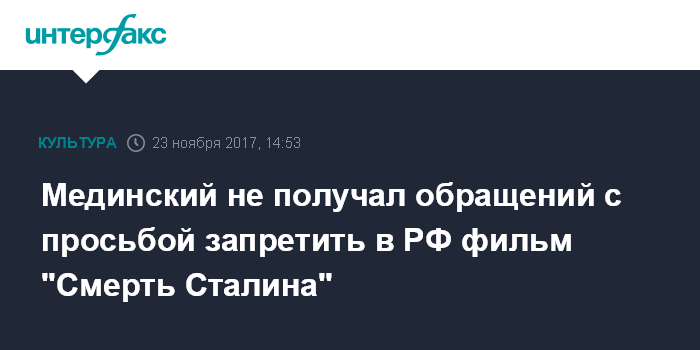 Москва. 23 ноября. INTERFAX.RU - Министр культуры РФ Владимир Мединский заявил, что к его ведомству не обращались с призывом запретить прокат фильма "Смерть Сталина".