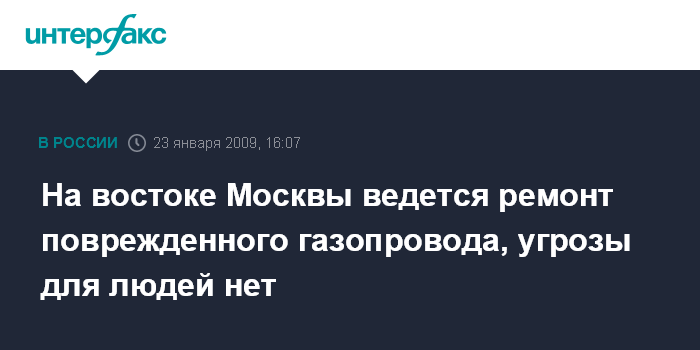 Москва. 23 января. INTERFAX.RU - На востоке Москвы начались ремонтно-восстановительные работы на месте аварии газопровода, сообщил "Интерфаксу" источник в комплексе городского хозяйства столицы в пятницу.