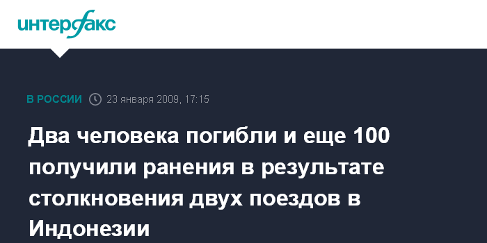 Москва. 23 января. INTERFAX.RU - По меньшей мере два человека погибли и еще 100 получили ранения, семь из которых тяжелые, в результате лобового столкновения пассажирского и товарного поездов на востоке острова Ява в Индонезии, сообщает телеканал "Метро-ТВ".