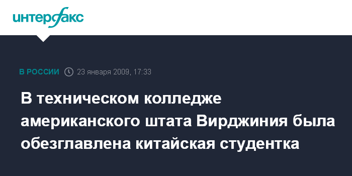 Москва. 23 января. INTERFAX.RU - Китайская студентка обезглавлена в техническом колледже американского штата Вирджиния, сообщает в пятницу британский телеканал Sky News.