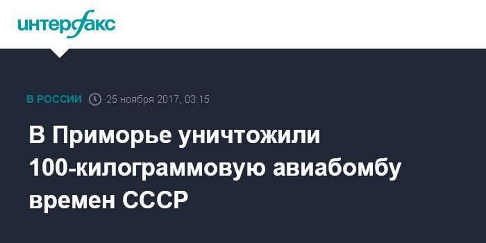 Москва. 25 ноября. INTERFAX.RU - Спасатели уничтожили фугасную авиабомбу (ФАБ-100) весом в 100 кг, накануне найденную в Хорольском районе Приморья, сообщил Амурский спасательный центр МЧС РФ.