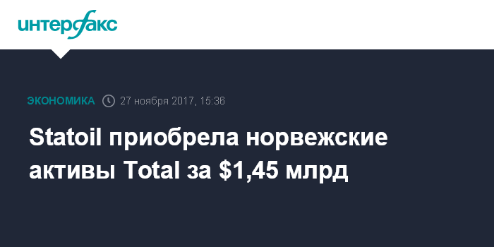 Москва. 27 ноября. INTERFAX.RU - Норвежская нефтедобывающая компания Statoil ASA достигла соглашения о приобретении активов на шельфе Норвегии у французской Total SA за $1,45 млрд, говорится в пресс-релизе компании.