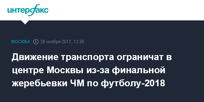 "В связи с проведением финальной жеребьевки чемпионата мира по футболу-2018 в Москве будет изменена схема движения. С 30 ноября по 1 декабря от Центрального выставочного зала "Манеж" до дома 11к11 по улице Моховая будет ограничено движение для автотранспорта", - сообщили "Интерфаксу" в пресс-службе ЦОДД.