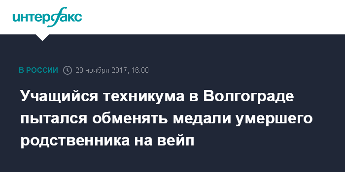 Москва. 28 ноября. INTERFAX.RU - Сотрудники полиции в Волгограде проводят проверку по факту размещения в интернете студентом техникума объявления об обмене государственных наград на вейп, сообщил агентству "Интерфакс" во вторник представитель регионального главка МВД Антон Корнаухов.