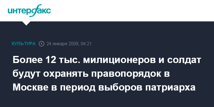 Москва. 24 января. ИНТЕРФАКС-МОСКВА - Во время мероприятий Русской православной церкви по выборам патриарха Московского и всея Руси охрану правопорядка в Москве будут обеспечивать свыше 12 тыс. сотрудников милиции и военнослужащих Внутренних войск.