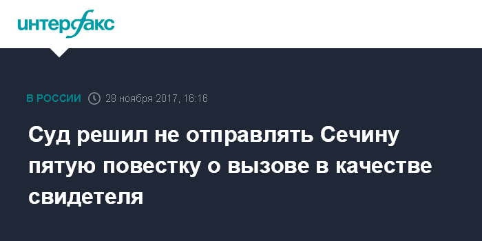 Суд решил не отправлять Сечину пятую повестку о вызове в качестве свидетеля