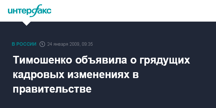 Киев. 24 января. ИНТЕРФАКС-УКРАИНА - В ближайшее время в правительстве Украины произойдут значительные кадровые изменения, сообщила в интервью "Зеркалу недели" премьер-министр Юлия Тимошенко.