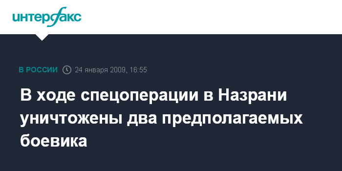 Москва. 24 января. INTERFAX.RU - В Назрани в субботу в ходе спецоперации, проводимой сотрудниками правоохранительных органов Ингушетии, уничтожены двое подозреваемых в участии в незаконных вооруженных формированиях.