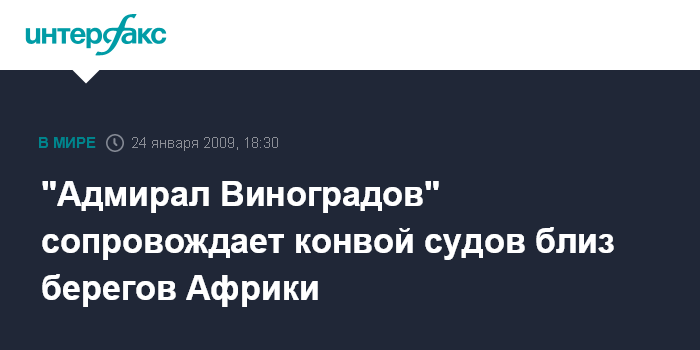 Москва. 24 января. INTERFAX.RU - Большой противолодочный корабль "Адмирал Виноградов" продолжает выполнять задачи по обеспечению безопасности судоходства в районе Африканского рога и в Аденском заливе, сообщил в субботу журналистам помощник главкома ВМФ России Игорь Дыгало.