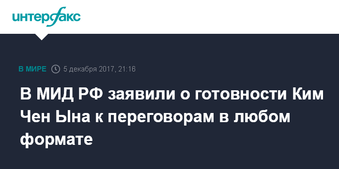 Москва. 5 декабря. INTERFAX.RU - Лидер КНДР Ким Чен Ын готов к переговорам в любом формате, заявил во вторник замглавы МИД РФ Игорь Моргулов.