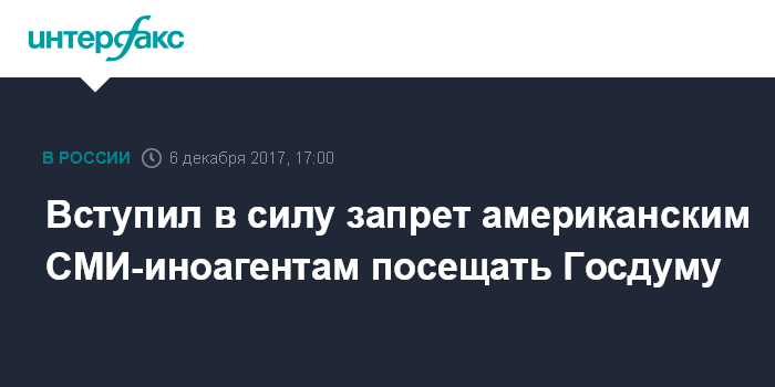 В Госдуме введение запрета назвали зеркальным ответом на действия США в отношении российских СМИ. Запрет коснулся двух СМИ, которые аккредитованы при МИД. Остальные семь американских СМИ аккредитации при МИД РФ не имеют.