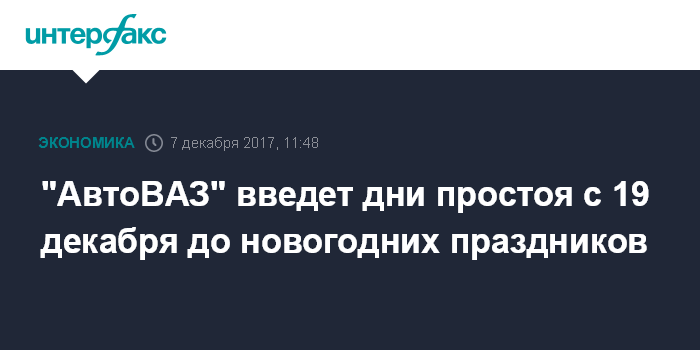 Москва. 7 декабря. INTERFAX.RU - "АвтоВАЗ" в преддверии новогодних праздников введет дни простоя на всех трех линиях конвейера, следует из приказа по компании о работе в декабре, копия которого имеется в распоряжении "Интерфакса".