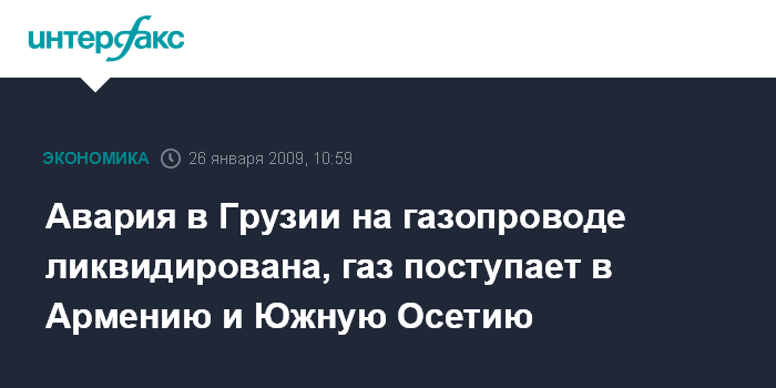 Москва. 26 января. INTERFAX.RU - Авария, произошедшая минувшей ночью на газоизмерительной станции "Квелети" на грузинском участке магистрального газопровода "Север-Юг", в результате которой была приостановлена поставка российского природного газа в Грузию и Армению, ликвидирована, сообщили "Интерфаксу" в ООО "Грузинская нефтяная и газовая корпорация" (GOGC).