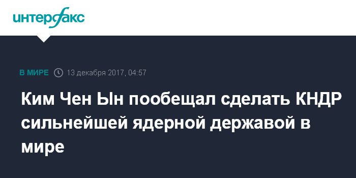Москва. 13 декабря. INTERFAX.RU - Северная Корея должна стать сильнейшей ядерной державой мира, заявил лидер КНДР Ким Чен Ын, выступая на национальной оборонной конференции, сообщает агентство "Рёнхап" со ссылкой на Центральное телеграфное агентство Кореи.