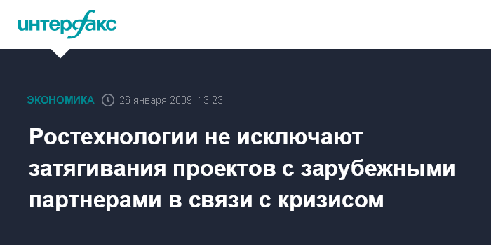 Москва. 26 января. INTERFAX.RU - Госкорпорация "Ростехнологии" не исключает затягивания сроков реализации проектов с иностранными партнерами из-за мирового экономического кризиса, заявил на пресс-конференции в Москве глава "Ростехнологий" Сергей Чемезов.