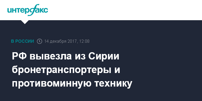 Москва. 14 декабря. INTERFAX.RU - Специальная инженерная и автомобильная техника отправлена из Сирии в РФ. Об этом сообщили в департаменте информации и массовых коммуникаций Министерства обороны РФ.