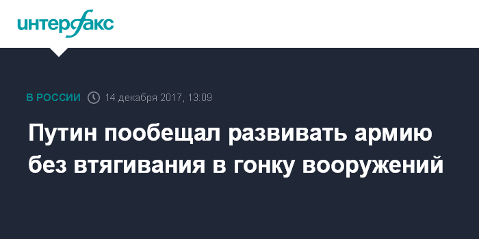Москва. 14 декабря. INTERFAX.RU - Россия будет развивать армию и флот без втягивания в гонку вооружений, и не разрушая бюджет, заявил президент РФ Владимир Путин.