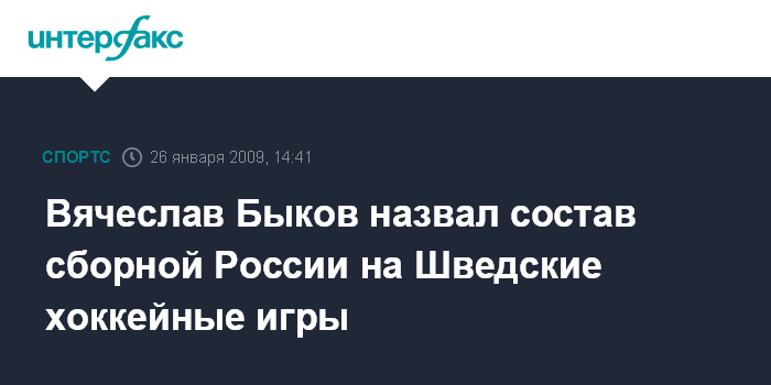 Москва. 26 января. INTERFAX.RU - Главный тренер сборной России по хоккею и московского ЦСКА Вячеслав Быков назвал список из 22 игроков национальной команды, которые выступят на третьем этапе Евротура, - "LG Шведские хоккейные игры" в Стокгольме 5-8 февраля, сообщает пресс-служба ФХР.