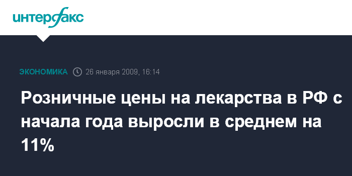 Москва. 26 января. INTERFAX.RU - Росздравнадзор отмечает рост розничных цен на лекарства на коммерческом рынке в среднем на 11% с начала 2009 г., говорится в пресс-релизе ведомства.