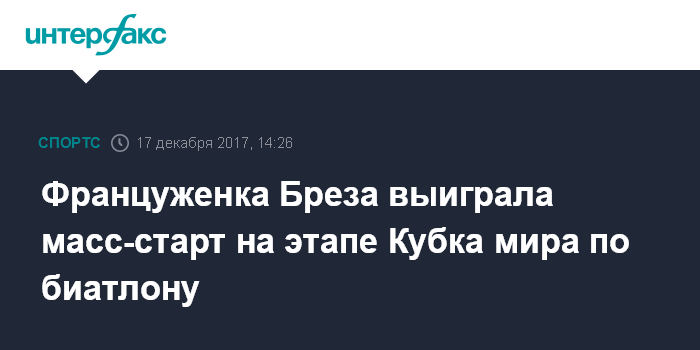 Москва. 17 декабря. INTERFAX.RU - Французская биатлонистка Жюстин Бреза стала победительницей гонки с общего старта (12,5 км), прошедшей во французском Анси в рамках очередного этапа Кубка мира.