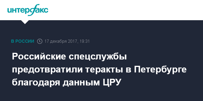 Москва. 17 декабря. INTERFAX.RU - Центральное разведывательное управление (ЦРУ) США передало российским коллегам информацию, которая помогла предотвратить взрывы в Санкт-Петербурге, сообщили в пресс-службе президента РФ. Как уточнили в Кремле, в воскресенье вечером по инициативе российской стороны состоялся телефонный разговор президента России Владимира Путина с президентом США Дональдом Трампом.