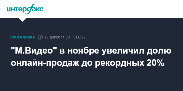 Москва. 19 декабря. INTERFAX.RU - Ритейлер "М.Видео", управляющий магазинами бытовой техники и электроники, в ноябре нарастил долю интернет-продаж до рекордных 20,2%.